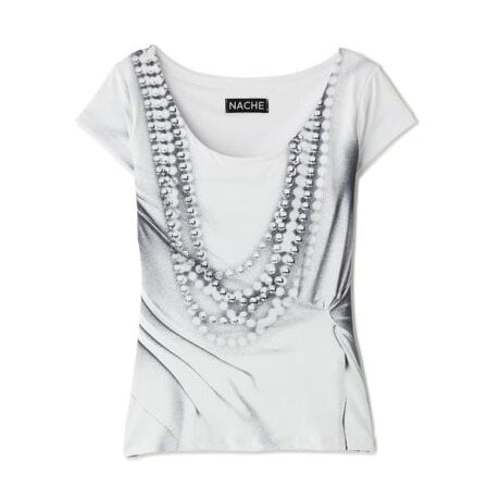 まるでパールネックレスを身に纏っているかのような、視覚的トリックが魅力の「PEARL NECKLACE PRINTED T-SHIRT」。