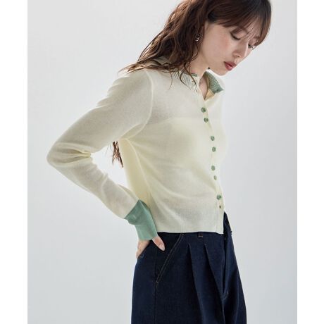 1枚あると重宝する、レイヤード風のカラーがアクセントになるカーディガン。
