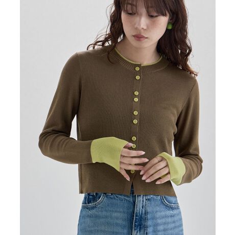 1枚あると重宝する、レイヤード風のカラーがアクセントになるカーディガン。