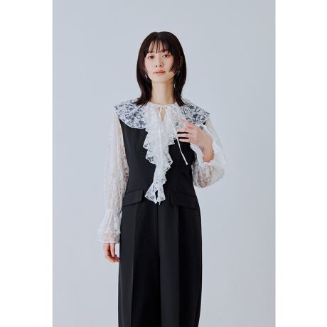 フロントに流れるラッフルとフレアスリーブで華やかさを添えたブラウス。