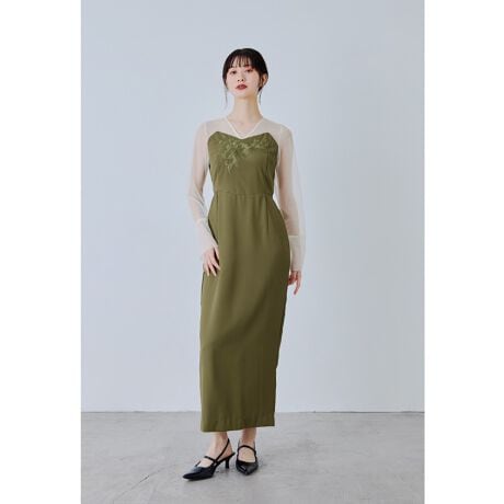デコルテからお袖にかけてチュール素材に切り替えて、袖口はカフス風に仕上げることできちんと感もプラス。