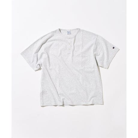 CHAMPIONに別注した、ヘンリーネックTシャツ。ブリーチウォッシュ加工を施し、ヴィンテージライクな風合いと奥行きのある表情に仕上げています。