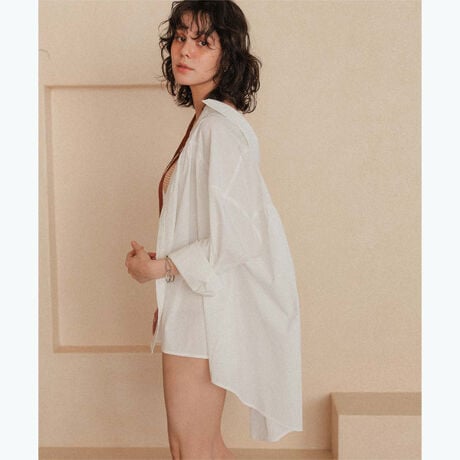 ・ベーシックながら、抜け感のあるシャツ・ギャザーデザインでフェミニンな印象に◎・オーバーサイズシルエット・UVケア機能付きの布帛素材・ビーチはもちろん、デイリーユースやレジャーシーンでも活躍できる優秀な1枚[型番:AHXT0543]