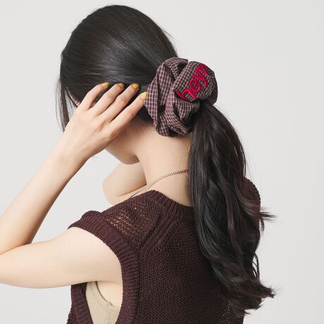 パジャマのようなチェック生地に大きくロゴを刺繍した存在感のあるシュシュ。