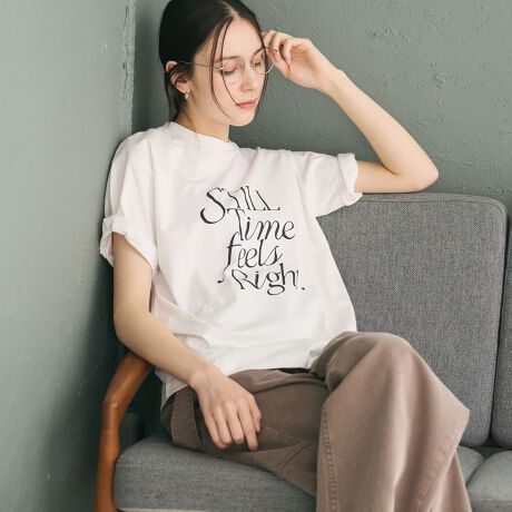 柔らかな雰囲気の文字やカラーで、日常のコーデに馴染みやすい一着です。
