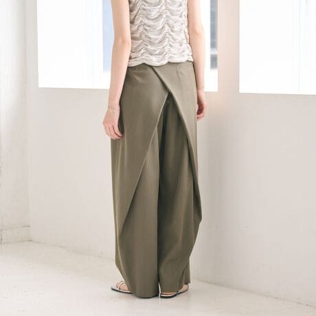 バックに大胆な分量感で施したラップディテールが特徴のワイドパンツ。