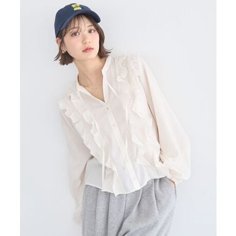 軽やかな素材感と立体的なフリルデザインが印象的なブラウスです。フロントにあしらわれたフリルが縦のラインを強調し、すっきりとした印象を与えながら華やかさもプラスしてくれます。首元のリボンはさりげないアクセントになり、結び方次第でフェミニンにも大人っぽくもアレンジが可能です。ふんわりとしたシルエットで体のラインを拾いにくく、リラックス感のある着心地も魅力です。デニムやパンツと合わせてカジュアルに、スカートと合わせてきれいめにと幅広いコーディネートに対応します。オンオフ問わず活躍する一枚です。