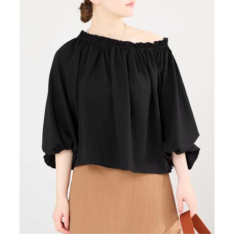 たっぷりとギャザーを寄せたネックラインと、ふんわりとしたボリュームスリーブが、着こなしにやわらかな華やかさを添えてくれます。