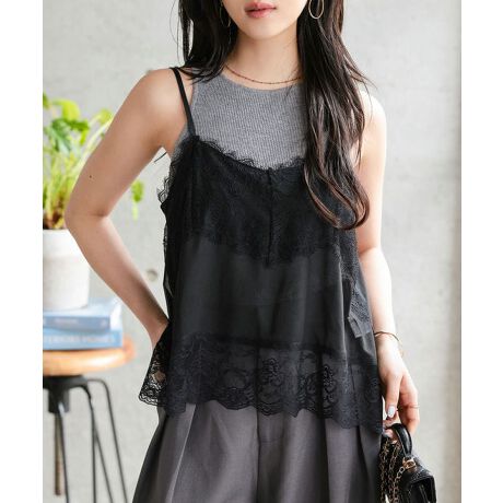 キャミソールは軽やかなシアー素材にレースをあしらい、レイヤードするだけで印象的なスタイリングに。