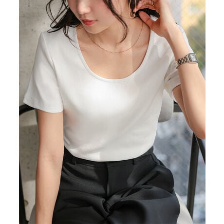 深めに開いたスクエアネック&Uネックで女性らしさ添える半袖シャツ。