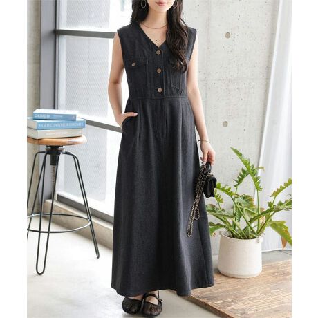 フロントのボタンディテールと胸ポケットがアクセントになった、上品カジュアルなデニムフレアジャンスカ。