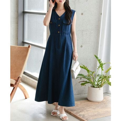 フロントのボタンディテールと胸ポケットがアクセントになった、上品カジュアルなデニムフレアジャンスカ。