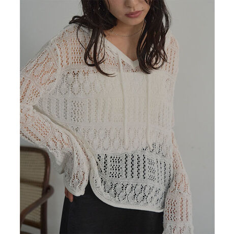表情ある透かし編みフーディートップス。