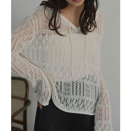 表情ある透かし編みフーディートップス。