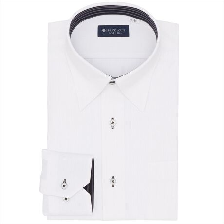使いやすい白ストライプ織柄の生地に台衿とカフス裏の別布使いが洒落感を演出してくれ、汚れも目立ちにくく一枚で着てもアクセントになるデザイン。