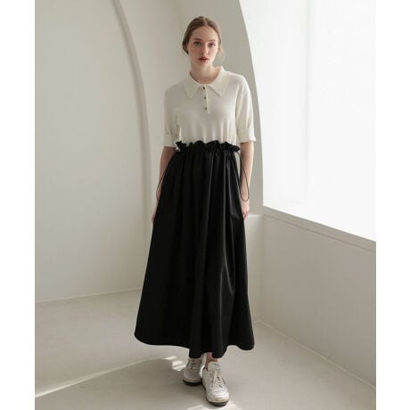 ニットトップスと程よくハリ感のある生地をドッキングしたワンピース。