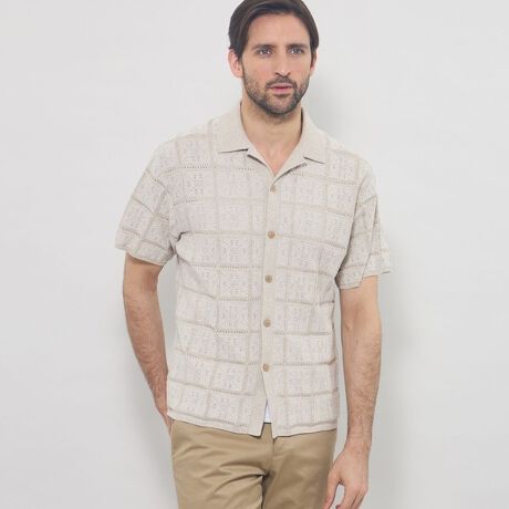 リラックスフィットのオープンカラーの前開きニットです。Tシャツの上からカーディガン感覚で羽織ったり、1枚で開襟シャツ感覚で着用可能です。アイレット編みで一部メッシュ状になっていますので、暑い時期の羽織りにもお勧めです。