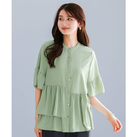 ブラウス 半袖 ペプラム アシンメトリー ティアード バンドカラー とろみ素材 きれいめ 体型カバー 夏トップス