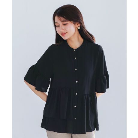 ブラウス 半袖 ペプラム アシンメトリー ティアード バンドカラー とろみ素材 きれいめ 体型カバー 夏トップス