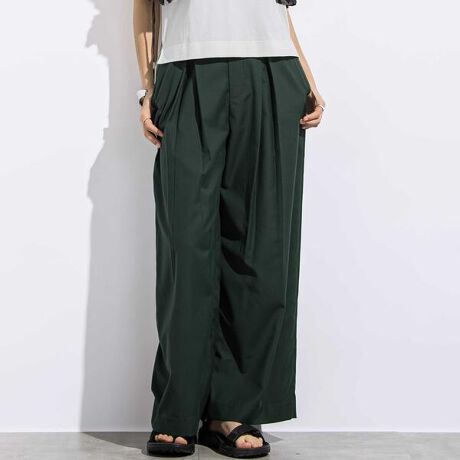 ウエストにタックを入れて裾に向けて広がるワイドシルエットに仕上げています。