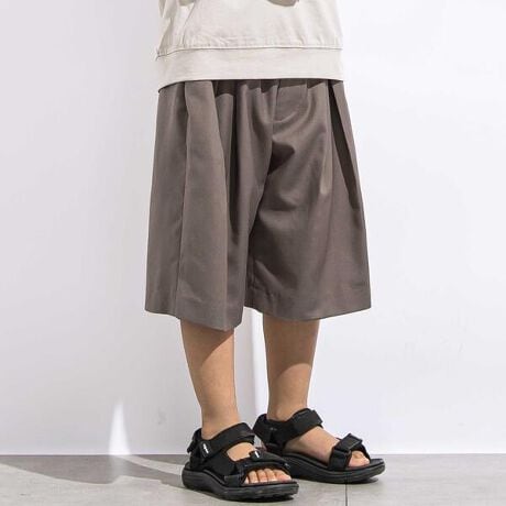ウエストにタックを入れて裾に向けて広がるワイドシルエットに仕上げています。