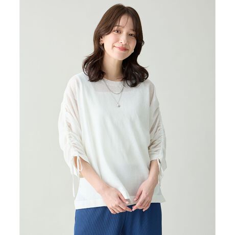 ・袖シャーリングがポイントの、ニュアンス感のあるシアーニット・ゆったりとしたサイズ感と、お腹まわりや腰まわりをカバーできる丈・シャーリングで袖丈変化が可能なので、好みのバランスを楽しめる