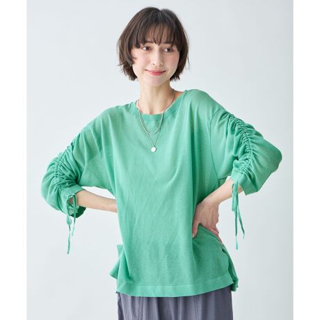 ・袖シャーリングがポイントの、ニュアンス感のあるシアーニット・ゆったりとしたサイズ感と、お腹まわりや腰まわりをカバーできる丈・シャーリングで袖丈変化が可能なので、好みのバランスを楽しめる