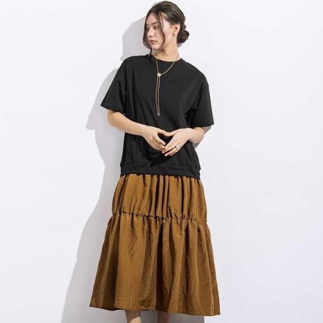 Tシャツとティアードスカートを合わせたようなドッキングデザインのワンピース。
