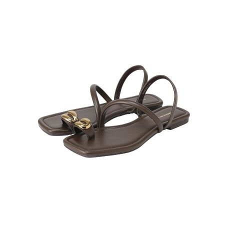 華やかなゴールドのメタルパーツが目を引く、洗練されたデザインのサンダルです。トング仕様で抜け感を演出しつつ、丸みのあるストラップが足をやさしく包み込み、安定した履き心地を叶えます。フラットに近いソールで歩きやすく、デイリー使いはもちろん、ちょっとしたお出かけにもぴったりです。シンプルながらも程よい存在感があり、パンツにもスカートにも合わせやすく、幅広いスタイリングに活躍します。大人のカジュアルスタイルに上品なアクセントをプラスしてくれる一足です。