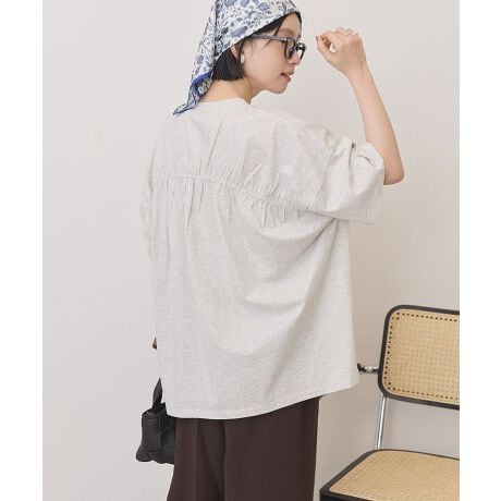 やわらかな雰囲気を演出するバックギャザーデザインが魅力のカットプルオーバーです。後ろにたっぷりと入ったギャザーが自然な立体感を生み出し、シンプルながらもさりげないデザイン性をプラスしています。丸みのあるコクーンシルエットが身体のラインをやさしく包み込み、ゆったりとした着心地でリラックス感のあるスタイルを楽しめます。程よい丈感でパンツにもスカートにも合わせやすく、幅広いコーディネートに活躍します。サイドスリットがさりげない抜け感を与え、動きやすさと軽やかな印象をプラスしてくれるのもポイントです。シンプルなデザインなのでデイリー使いしやすく、カジュアルながらも大人らしい落ち着いた雰囲気を演出します。毎日のコーディネートに取り入れやすく、季節を問わず長く活躍する便利な一着です。