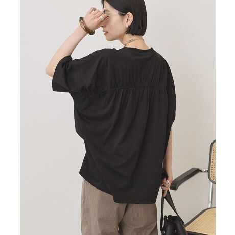 やわらかな雰囲気を演出するバックギャザーデザインが魅力のカットプルオーバーです。後ろにたっぷりと入ったギャザーが自然な立体感を生み出し、シンプルながらもさりげないデザイン性をプラスしています。丸みのあるコクーンシルエットが身体のラインをやさしく包み込み、ゆったりとした着心地でリラックス感のあるスタイルを楽しめます。程よい丈感でパンツにもスカートにも合わせやすく、幅広いコーディネートに活躍します。サイドスリットがさりげない抜け感を与え、動きやすさと軽やかな印象をプラスしてくれるのもポイントです。シンプルなデザインなのでデイリー使いしやすく、カジュアルながらも大人らしい落ち着いた雰囲気を演出します。毎日のコーディネートに取り入れやすく、季節を問わず長く活躍する便利な一着です。