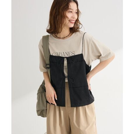 繊細なレース刺繍が上品な印象を与えてくれるビスチェです。前後2WAY仕様で、その日の気分やコーディネートに合わせて異なる表情を楽しめるのが魅力です。華奢なストラップと軽やかな素材感が女性らしい抜け感を演出し、いつものスタイルにプラスするだけでぐっとおしゃれ度が高まります。Tシャツやシャツ、ワンピースとのレイヤードスタイルにもぴったりで、シンプルなコーディネートに奥行きをプラスしてくれます。季節を問わず活躍し、着回しの幅を広げてくれる一着です。