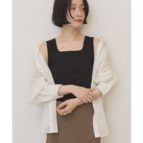 顔まわりをきれいに見せてくれるスクエアネックデザインが魅力のタンクトップです。首元をすっきりと見せながら、上品で女性らしい印象を演出してくれます。程よく体に沿うリブ素材は伸縮性があり、動きやすく快適な着心地です。シンプルなデザインなので、カーディガンやシャツ、ジャケットのインナーとしても使いやすく、幅広いコーディネートに活躍します。パンツやスカートと合わせて一枚で着ても、すっきりとした大人カジュアルスタイルが楽しめます。ベーシックなアイテムだからこそ着回し力が高く、デイリーコーデからお出かけまでさまざまなシーンで取り入れやすいのも魅力です。ワードローブに一枚あると重宝する、シンプルで使いやすい定番アイテムです。