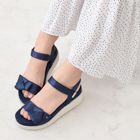 リボンのパーツがガーリーなサンダル。リボンについた小さなパーツや、中底に使用されている立体感のあるジャガードなど、細部まで凝ったデザインが魅力的。普段のコーディネートをよりオシャレに見せてくれるアイテムです。履き心地がよく、面ファスナー仕様の足首ベルトで太さを調節できるのも嬉しいポイントです。