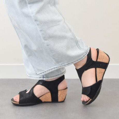 つま先ベルトと足首ベルトが面ファスナーなので調整がしやすく、安定感のよい履き心地。