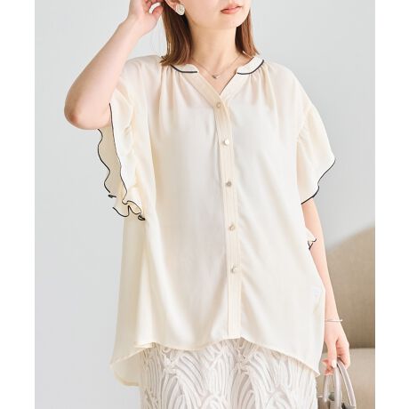 配色パイピングが目を引く、上品なデザインブラウス。