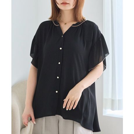 配色パイピングが目を引く、上品なデザインブラウス。
