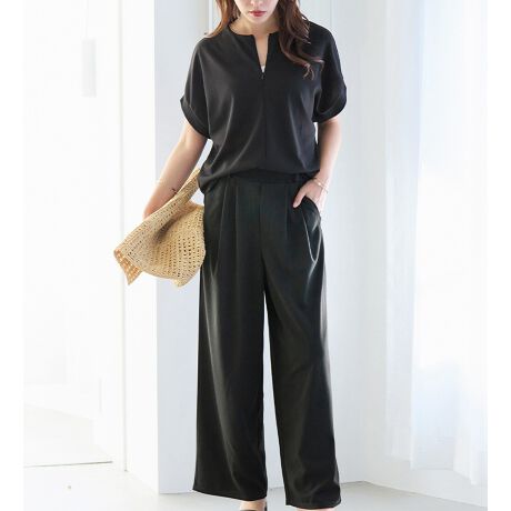 上下同素材で仕立てたブラウスとタックパンツのセットアップ