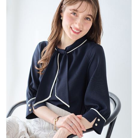 ボウタイデザインと袖口のパールがアクセントの上品ブラウス。