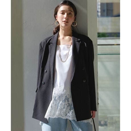 ■デザイン旬のレイヤードスタイルが叶う、ヘムレースキャミソール。ゆとりのあるフレアシルエットで、動きのあるヘムラインが特徴です。身頃には透け感の少ないシャツ素材を使用し、1枚でもヘルシーな印象でご着用いただけます。紐先のゴールドが、バックスタイルのさりげないアクセントに。肩紐はお好みの長さで調節いただけます。ジャケットやカーディガンのインナーとして、レースを裾からのぞかせるとコーデのアクセントになります。夏はTシャツやタンクトップに重ねても着用でき、ロングシーズン使える一枚です。