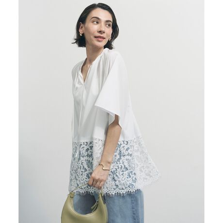 ■デザイン繊細なレース使いとボリューム感が贅沢なギャザーブラウス。裾にあしらったスカラレースがポイントです。たっぷりとした分量感とヒップが隠れる安心な着丈ながら、軽やかにご着用いただけます。ネックはスキッパー開きの使用で、顔周りをすっきりと見せてくれます。デニムやカーゴパンツなど、カジュアルなボトムとのMIXスタイリングがおすすめです。