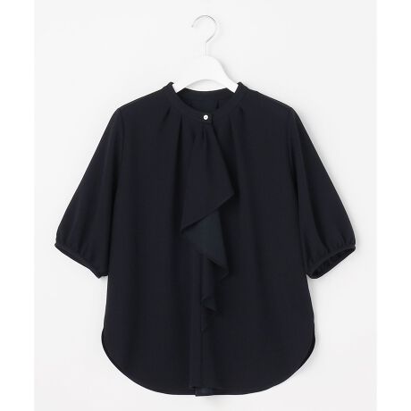 インもアウトも様になる着回し力の高いブラウス■デザインアムンゼンジャージーならではの繊細なシボ感が美しい素材を活かし、ブラウスのように上品に仕上げたジャージートップスです。前立てに施したタックとラッフル襟が華やかなアクセントになり、1枚で着映えるデザインが魅力です。ラッフルの端の長さを細かく調整しているので、インでもアウトでもバランス良く着て頂けます。さらっとジャケットと合わせて頂くのもおすすめです。■素材表面に不規則な凹凸感のある梨地組織です。ドライ感があるので肌触りもサラっとしています。一見布帛地のように見えますが、ストレッチ性があるのでリラックス感も兼ね備えた素材です。