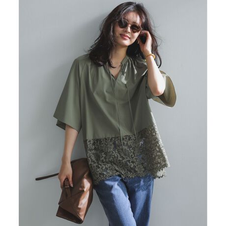 ■デザイン繊細なレース使いとボリューム感が贅沢なギャザーブラウス。裾にあしらったスカラレースがポイントです。たっぷりとした分量感とヒップが隠れる安心な着丈ながら、軽やかにご着用いただけます。ネックはスキッパー開きの使用で、顔周りをすっきりと見せてくれます。デニムやカーゴパンツなど、カジュアルなボトムとのMIXスタイリングがおすすめです。