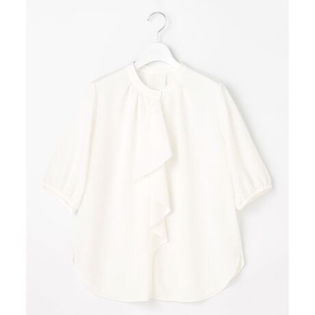インもアウトも様になる着回し力の高いブラウス■デザインアムンゼンジャージーならではの繊細なシボ感が美しい素材を活かし、ブラウスのように上品に仕上げたジャージートップスです。前立てに施したタックとラッフル襟が華やかなアクセントになり、1枚で着映えるデザインが魅力です。ラッフルの端の長さを細かく調整しているので、インでもアウトでもバランス良く着て頂けます。さらっとジャケットと合わせて頂くのもおすすめです。■素材表面に不規則な凹凸感のある梨地組織です。ドライ感があるので肌触りもサラっとしています。一見布帛地のように見えますが、ストレッチ性があるのでリラックス感も兼ね備えた素材です。