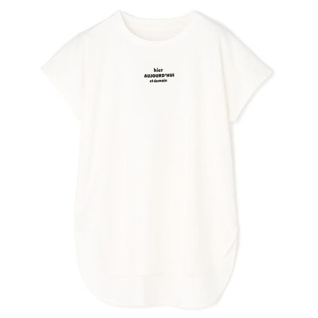 光沢のあるロゴ刺繍が、コーデのワンポイントになります。カジュアルすぎないスッキリとしたネックラインで、ゆとりがありながらも綺麗に見える絶妙なサイジングに。軽やかに仕上げたフレンチスリーブは、気になる二の腕も見せすぎないバランスに仕上がっています。前後差のある裾のシャツテールデザインで、トップスアウトもおしゃれに決まります。カラーによって異なるロゴデザインなので、気分に合わせてお好みの色や柄をお選びいただけます。ロゴの文字は、一日を快適に過ごしていただけるような前向きな言葉をアレンジしています。