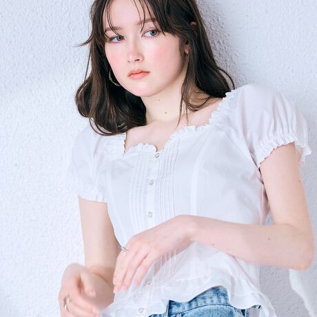 ・ふんわりと可愛らしいパフスリーブや裾のギャザー使い、コルセット風シルエットなどロマンティックな要素を盛り込んだデザインブラウス。