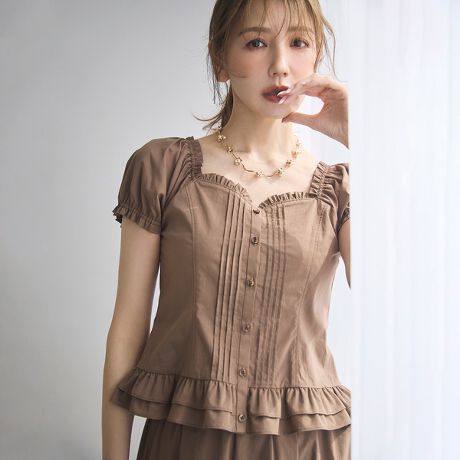 ・ふんわりと可愛らしいパフスリーブや裾のギャザー使い、コルセット風シルエットなどロマンティックな要素を盛り込んだデザインブラウス。