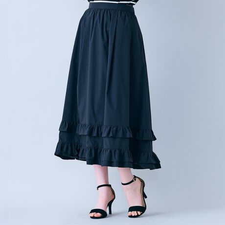 ・デイリーに使い回しやすい、裾フリルがポイントのロングスカート。