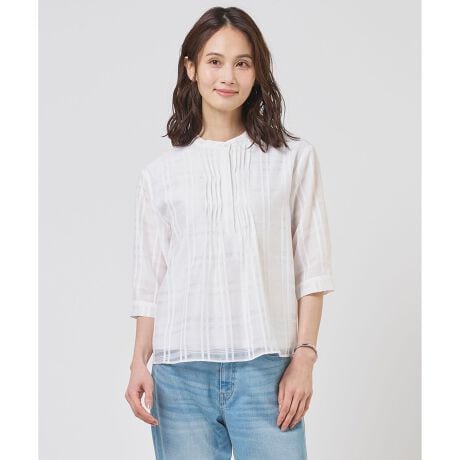 ■デザイン程よい透け感のある大柄チェックがポイントのカットソー。前身頃にはピンタックを施し、さりげない立体感と奥行きのある表情に仕上げました。首元はすっきりとしたバンドカラーとかぶり仕様の前立てで、洗練された大人の雰囲気に。身頃部分はジャージ素材を重ねた2枚仕立てになっているため、インナーの透けを気にせず、心地よい肌触りも魅力です。きれいめなボトムスと合わせてお仕事に、デニムやカジュアルパンツと合わせれば休日のお出かけにと、オンオフ問わず幅広いシーンで活躍するアイテムです。カラーは、清潔感のあるホワイト(#301)、爽やかな印象のグレイッシュサックス(#372)、奥行きのある落ち着いた印象のダルブルー(#374)の3色展開です。