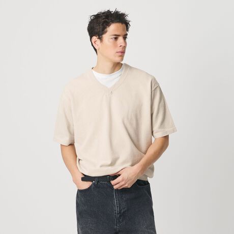 Vネックですが、首元は丸みがあり、開きも浅めなので、クルーネックに近い感覚で着られます。